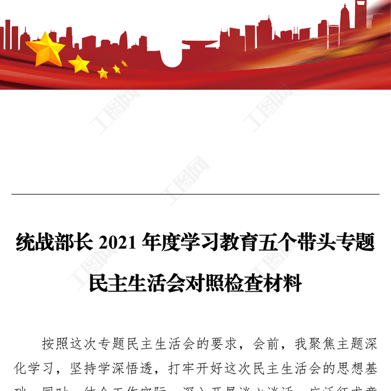 工圖網(wǎng)提供統(tǒng)戰(zhàn)部長2021年度學(xué)習(xí)教育五個帶頭專題民主生活會對照檢查材料供會員免費(fèi)下載。更多精彩黨課PPT素材,盡在工圖網(wǎng)。