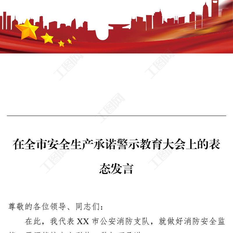 工圖網(wǎng)提供在全市安全生產(chǎn)承諾警示教育大會上的表態(tài)發(fā)言供會員免費下載。更多精彩黨課PPT素材,盡在工圖網(wǎng)。