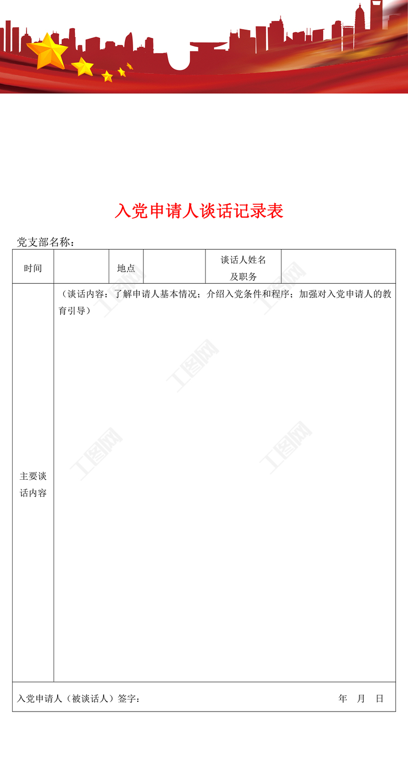 工圖網(wǎng)提供2021年入黨申請(qǐng)人談話記錄表供會(huì)員免費(fèi)下載。更多精彩黨課PPT素材,盡在工圖網(wǎng)。