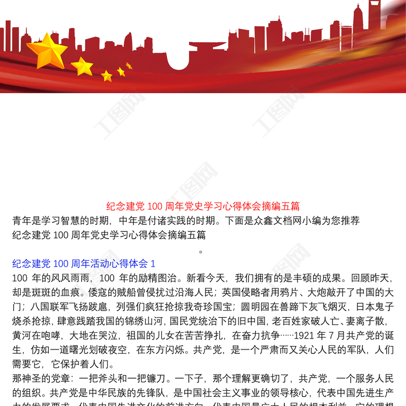 工圖網(wǎng)提供紀念建黨100周年黨史學習心得體會摘編五篇供會員免費下載。更多精彩黨課PPT素材,盡在工圖網(wǎng)。