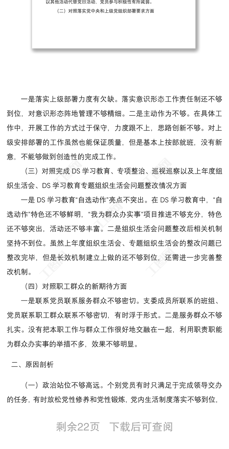 工圖網(wǎng)提供2022年支部班子國(guó)企黨支部組織生活會(huì)四個(gè)對(duì)照對(duì)照履行黨章規(guī)定的職責(zé)任務(wù)落實(shí)上級(jí)部署要求完成黨史學(xué)習(xí)教育專(zhuān)項(xiàng)整治人民群眾的新期待等方面檢查材料4份供會(huì)員免費(fèi)下載。更多精彩黨課PPT素材,盡在工圖網(wǎng)。