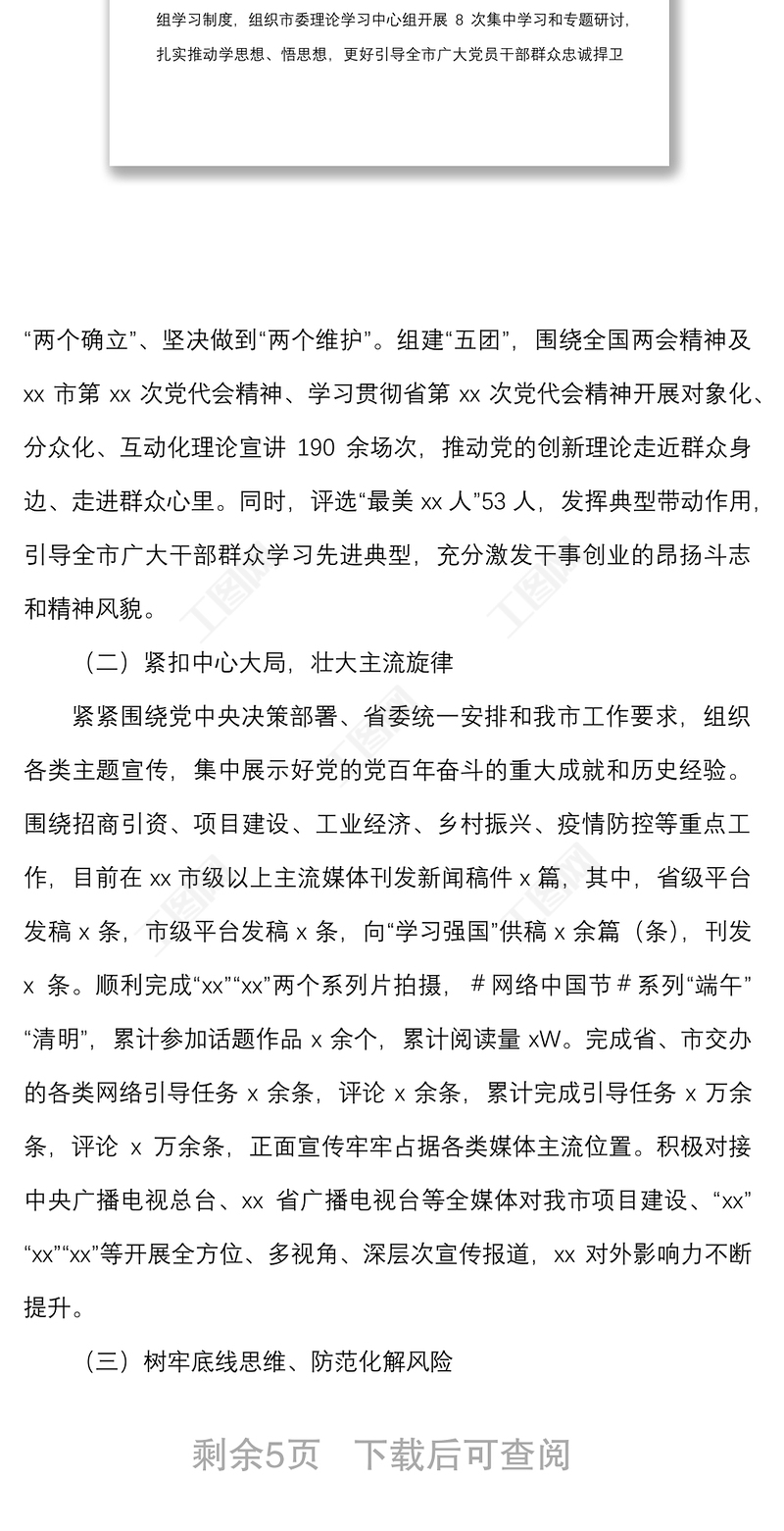 工圖網(wǎng)提供市委宣傳部2022年上半年工作總結(jié)及下半年重點(diǎn)工作計(jì)劃范文供會(huì)員免費(fèi)下載。更多精彩黨課PPT素材,盡在工圖網(wǎng)。