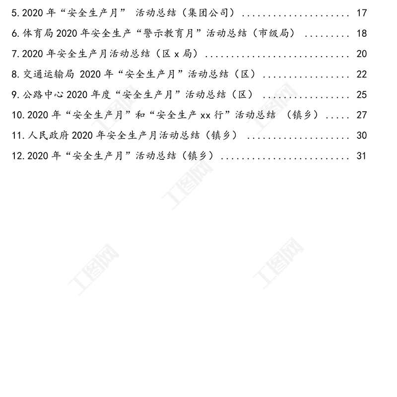 工圖網(wǎng)提供2020年安全生產(chǎn)月活動總結(jié)范文匯編(12篇)(含集團公司學(xué)校)供會員免費下載。更多精彩黨課PPT素材,盡在工圖網(wǎng)。