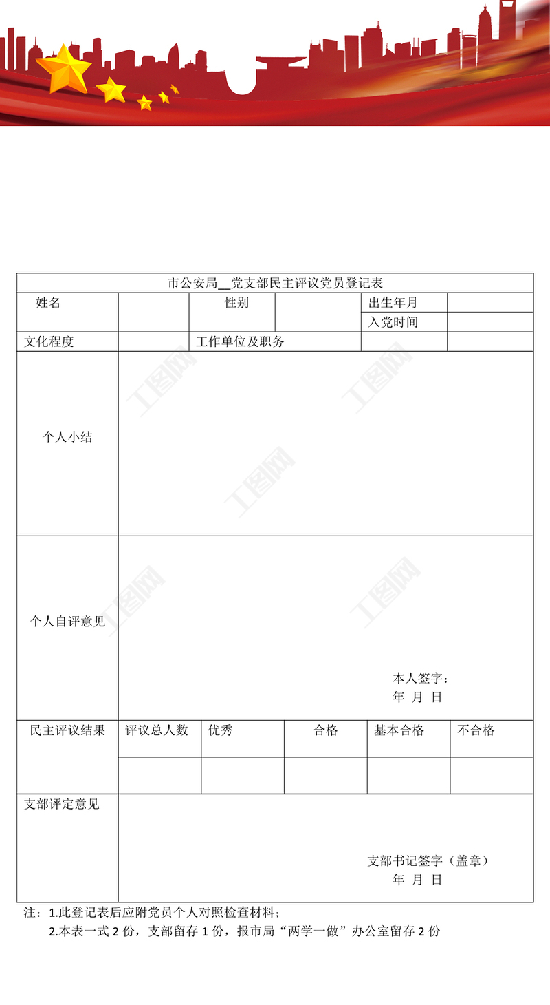 工圖網(wǎng)提供2023市公安局__黨支部民主評議黨員登記表供會員免費下載。更多精彩黨課PPT素材,盡在工圖網(wǎng)。