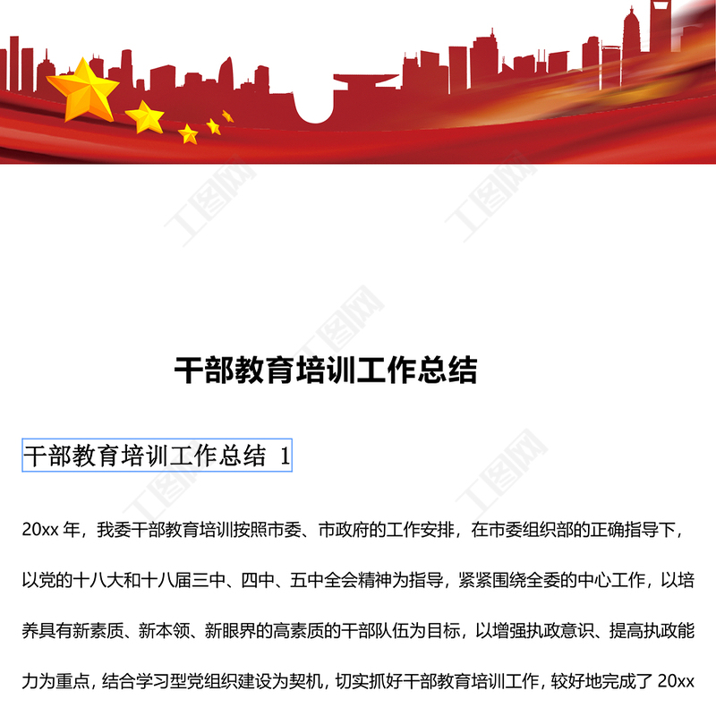 工圖網(wǎng)提供干部教育培訓(xùn)工作總結(jié)范文供會(huì)員免費(fèi)下載。更多精彩黨課PPT素材,盡在工圖網(wǎng)。