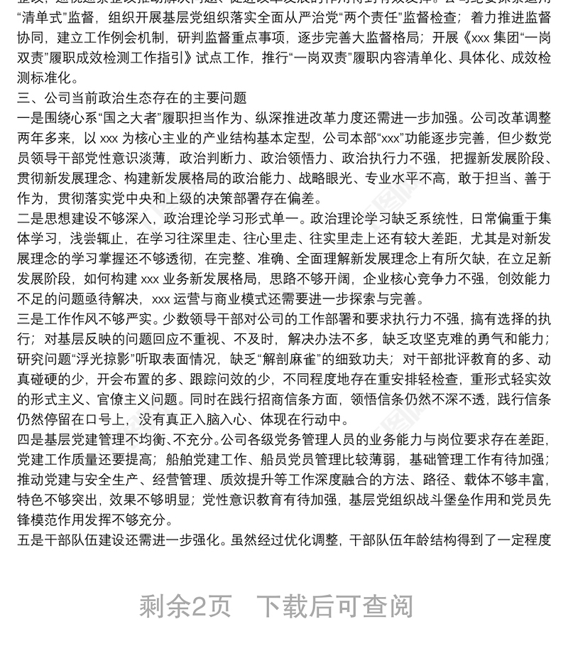 2022年政治生態(tài)分析研判情況的報告國有企業(yè)2022年黨建工作思路2021國有企業(yè)領(lǐng)導(dǎo)班子學(xué)黨史心得2022年政治生態(tài)分析研判的情況報告2022政治生態(tài)分析研判整改落實情況報告2022政治安全分析研判報告2022黨支部政治生態(tài)分析研判報告2022銀行政治生態(tài)綜合分析報告2021國有企業(yè)黨員黨史學(xué)習(xí)心得國有企業(yè)支部書記黨課講稿2021專題黨課2021黨課 學(xué)黨史 國有企業(yè)2022民政局政治生態(tài)分析報告2021國有企業(yè)關(guān)于黨的十九演講稿2021個人政治生態(tài)分析報告2022年鄉(xiāng)鎮(zhèn)政治生態(tài)分析研判報告
