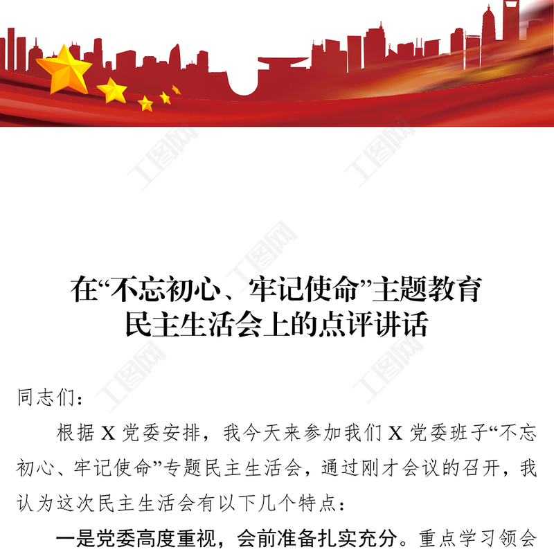 工圖網(wǎng)提供不忘初心主題教育民主生活會(huì)點(diǎn)評(píng)發(fā)言供會(huì)員免費(fèi)下載。更多精彩黨課PPT素材,盡在工圖網(wǎng)。