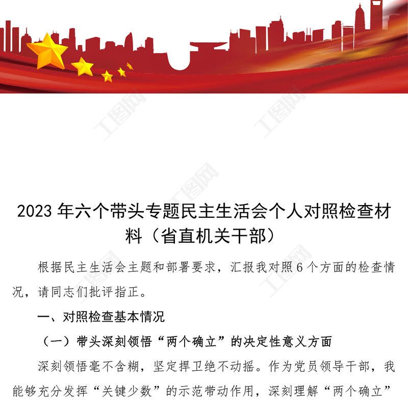 工圖網(wǎng)提供2023年六個(gè)帶頭專題民主生活會(huì)個(gè)人對(duì)照檢查材料(省直機(jī)關(guān)干部)供會(huì)員免費(fèi)下載。更多精彩黨課PPT素材,盡在工圖網(wǎng)。