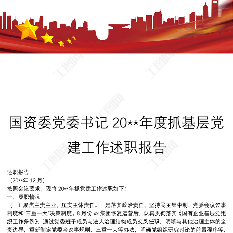 工圖網(wǎng)提供國資委黨委書記20**年度抓基層黨建工作述職報(bào)告供會(huì)員免費(fèi)下載。更多精彩黨課PPT素材,盡在工圖網(wǎng)。