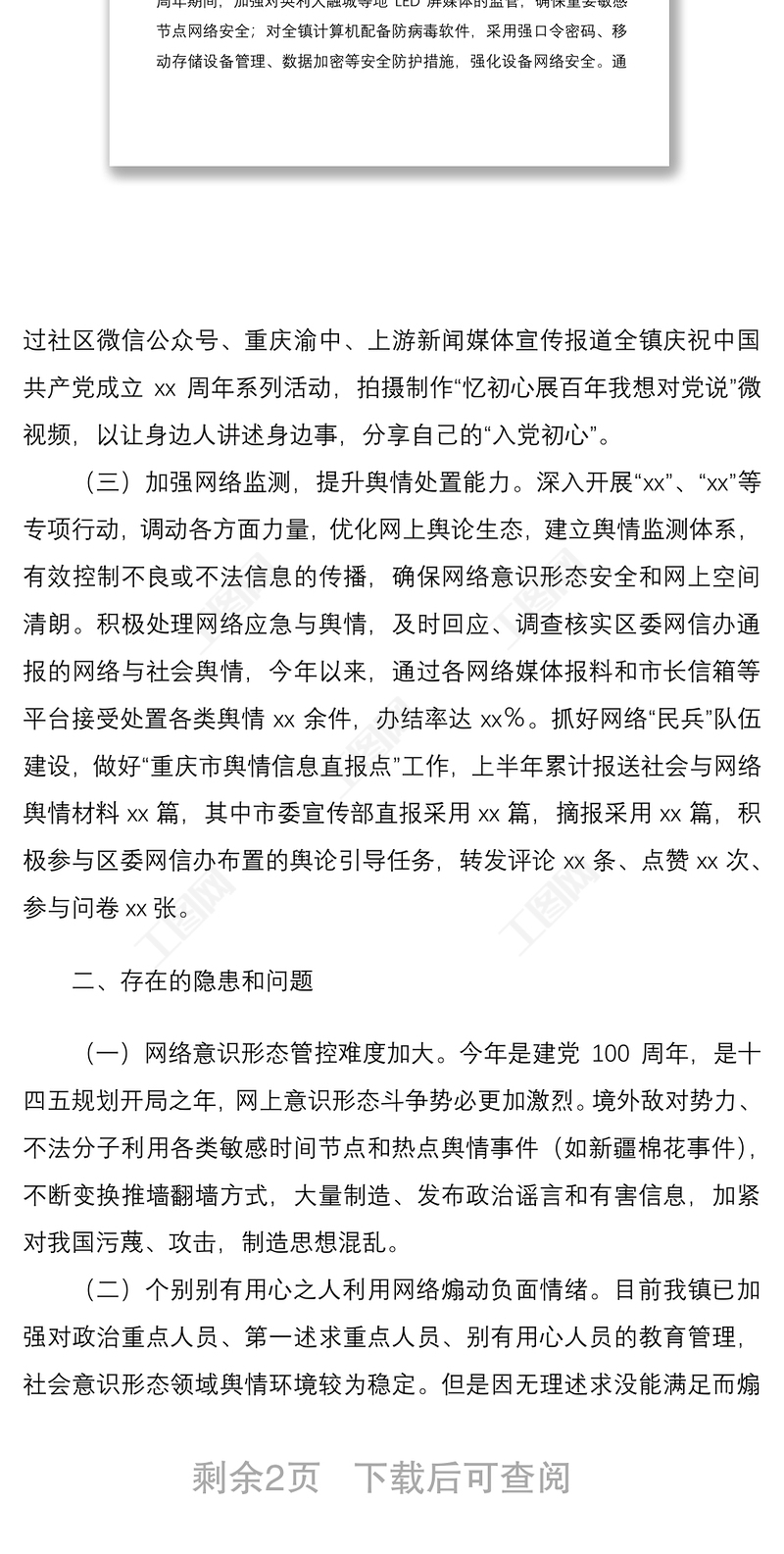 工圖網(wǎng)提供2021年上半年網(wǎng)絡(luò)意識(shí)形態(tài)工作總結(jié)范文工作匯報(bào)報(bào)告供會(huì)員免費(fèi)下載。更多精彩黨課PPT素材,盡在工圖網(wǎng)。