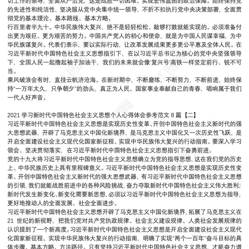 > 心得體會(huì) > 2021學(xué)習(xí)新時(shí)代中國(guó)特色社會(huì)主義思想個(gè)人心得體會(huì)參考范文8篇.DOCX 【圖片、文字、動(dòng)畫(huà)均可編輯】