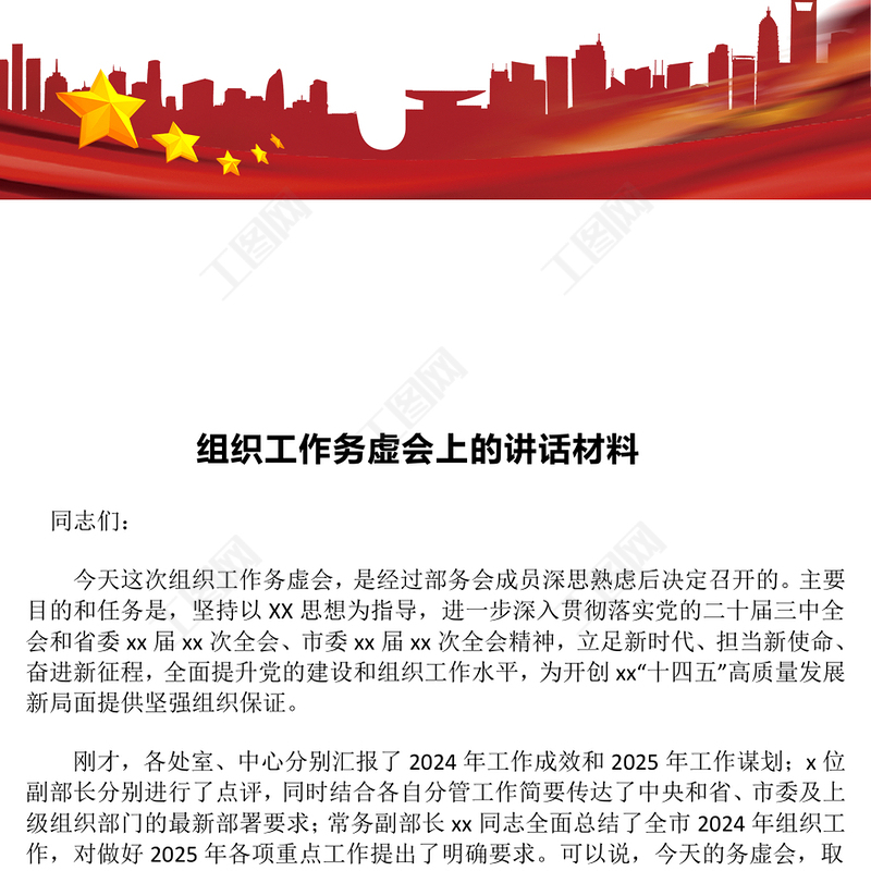 工圖網(wǎng)提供組織工作務虛會上的講話材料下載供會員免費下載。更多精彩黨課PPT素材,盡在工圖網(wǎng)。