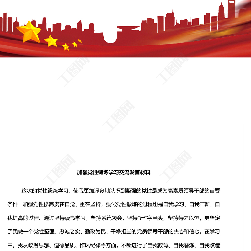 工圖網(wǎng)提供加強(qiáng)黨性鍛煉學(xué)習(xí)交流發(fā)言材料供會(huì)員免費(fèi)下載。更多精彩黨課PPT素材,盡在工圖網(wǎng)。