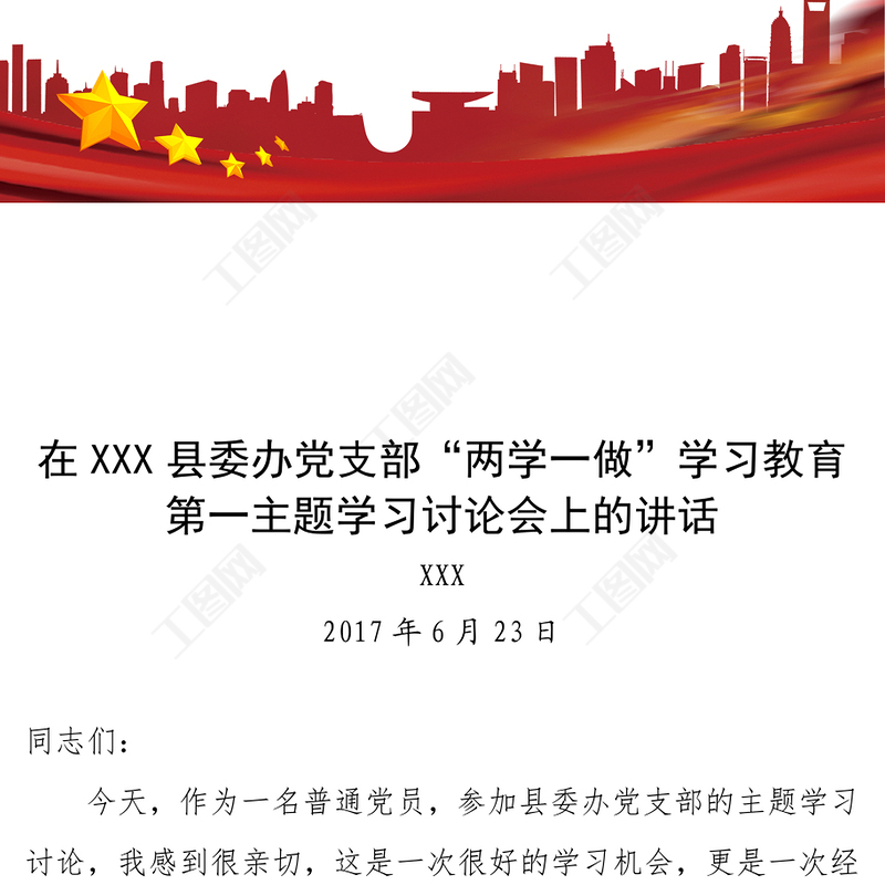 工圖網(wǎng)提供在XXX縣委辦黨支部“兩學(xué)一做”學(xué)習(xí)教育第一主題學(xué)習(xí)討論會上的講話供會員免費下載。更多精彩黨課PPT素材,盡在工圖網(wǎng)。