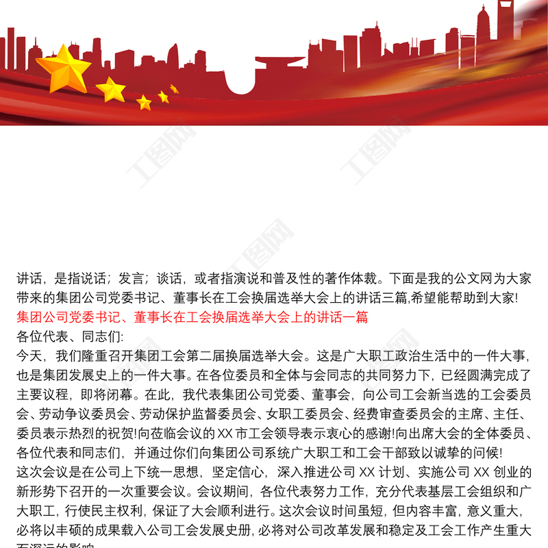 工圖網(wǎng)提供[集團(tuán)公司工會換屆選舉方案]集團(tuán)公司黨委書記、董事長在工會換屆選舉大會上的講話三篇供會員免費下載。更多精彩黨課PPT素材,盡在工圖網(wǎng)。