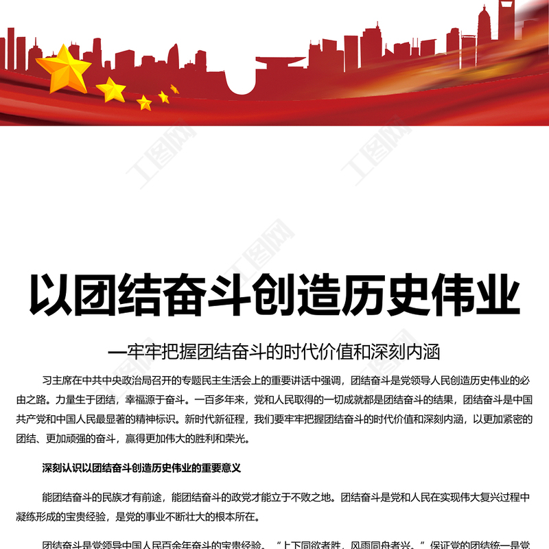 工圖網(wǎng)提供以團(tuán)結(jié)奮斗創(chuàng)造歷史偉業(yè)PPT黨政風(fēng)牢牢把握?qǐng)F(tuán)結(jié)奮斗的時(shí)代價(jià)值和深刻內(nèi)涵課件模板(講稿)供會(huì)員免費(fèi)下載。更多精彩黨課PPT素材,盡在工圖網(wǎng)。
