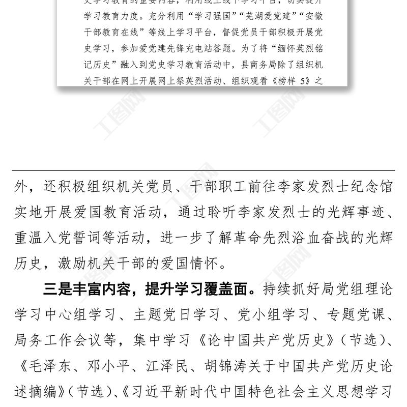 工圖網(wǎng)提供x縣商務(wù)局黨史學(xué)習(xí)教育活動(dòng)特色活動(dòng)開(kāi)展情況總結(jié)供會(huì)員免費(fèi)下載。更多精彩黨課PPT素材,盡在工圖網(wǎng)。