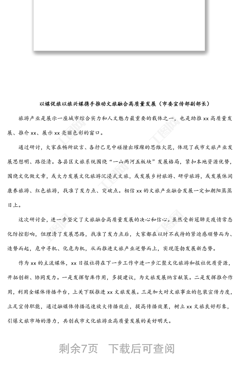 工圖網(wǎng)提供在2022年文旅產(chǎn)業(yè)融媒體宣傳研討會(huì)上的發(fā)言匯編(8篇)供會(huì)員免費(fèi)下載。更多精彩黨課PPT素材,盡在工圖網(wǎng)。