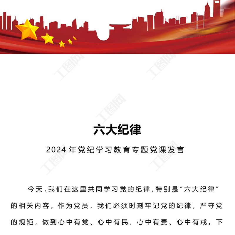 工圖網(wǎng)提供六大紀(jì)律PPT簡(jiǎn)潔大氣2024年黨紀(jì)學(xué)習(xí)教育專題黨課發(fā)言(講稿)供會(huì)員免費(fèi)下載。更多精彩黨課PPT素材,盡在工圖網(wǎng)。