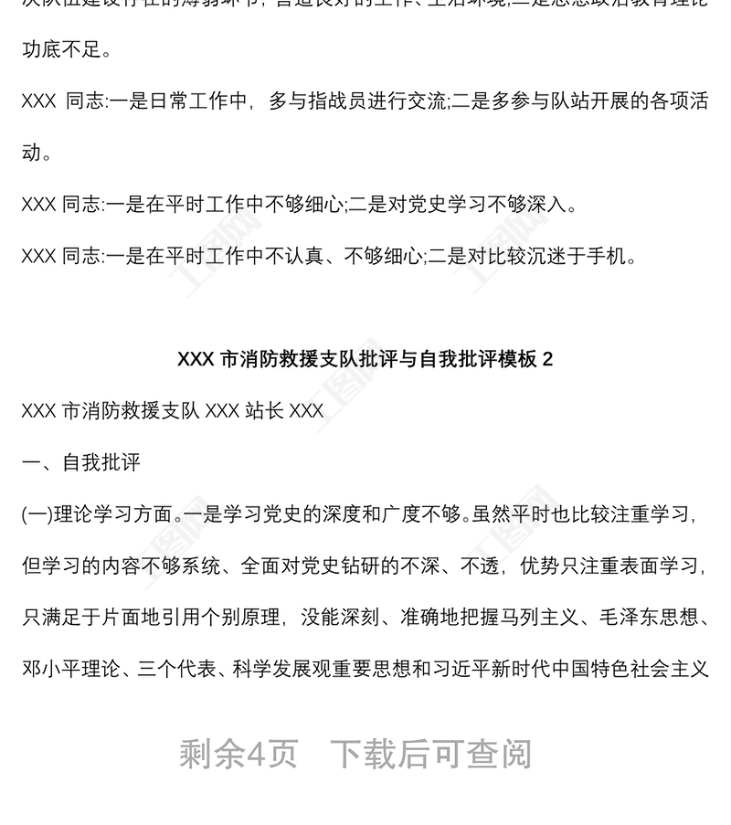 工圖網(wǎng)提供(5篇)XXX市消防救援支隊(duì)批評(píng)與自我批評(píng)模板供會(huì)員免費(fèi)下載。更多精彩黨課PPT素材,盡在工圖網(wǎng)。