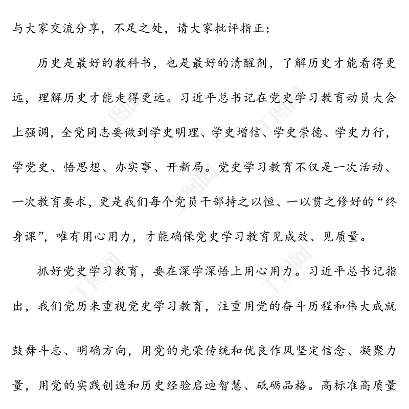 工圖網(wǎng)提供黨史學(xué)習(xí)教育研討發(fā)言材料供會員免費下載。更多精彩黨課PPT素材,盡在工圖網(wǎng)。