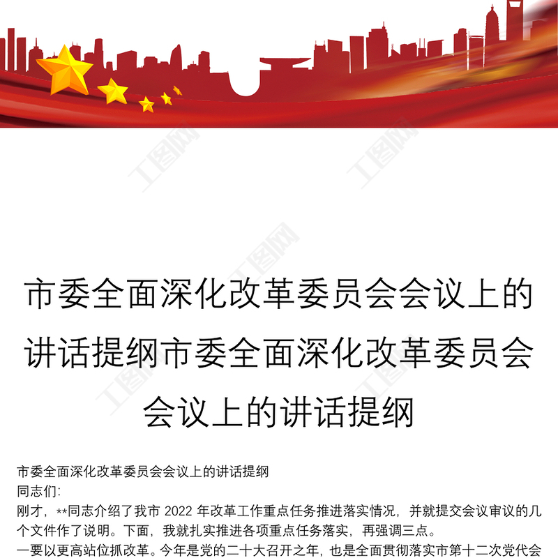 工圖網(wǎng)提供市委全面深化改革委員會(huì)會(huì)議上的講話提綱市委全面深化改革委員會(huì)會(huì)議上的講話提綱供會(huì)員免費(fèi)下載。更多精彩黨課PPT素材,盡在工圖網(wǎng)。