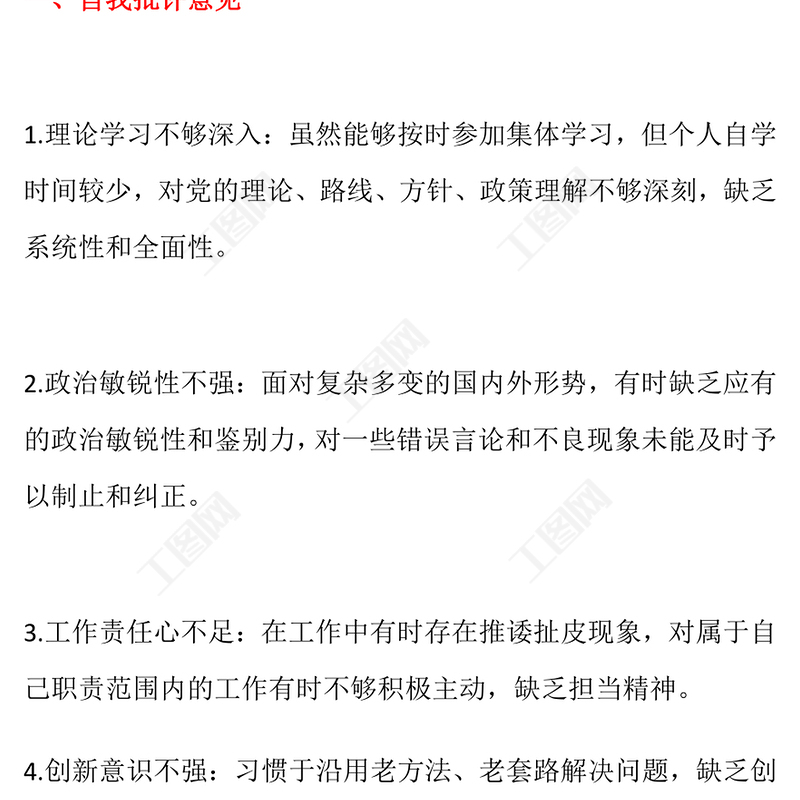 工圖網(wǎng)提供組織生活會(huì)上的批評(píng)與自我批評(píng)意見(30條)范文供會(huì)員免費(fèi)下載。更多精彩黨課PPT素材,盡在工圖網(wǎng)。