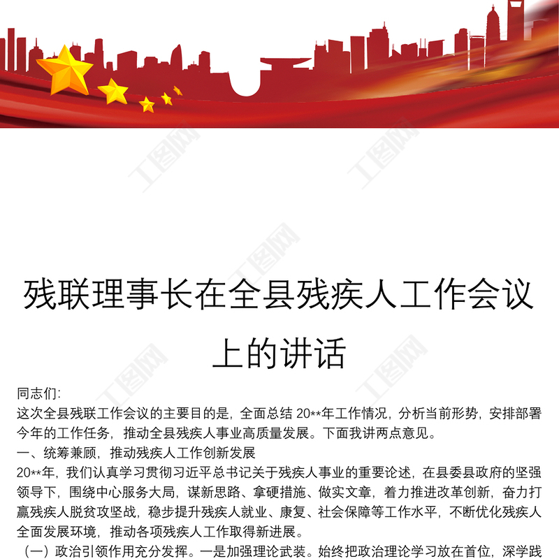 工圖網(wǎng)提供殘聯(lián)理事長(zhǎng)在全縣殘疾人工作會(huì)議上的講話供會(huì)員免費(fèi)下載。更多精彩黨課PPT素材,盡在工圖網(wǎng)。