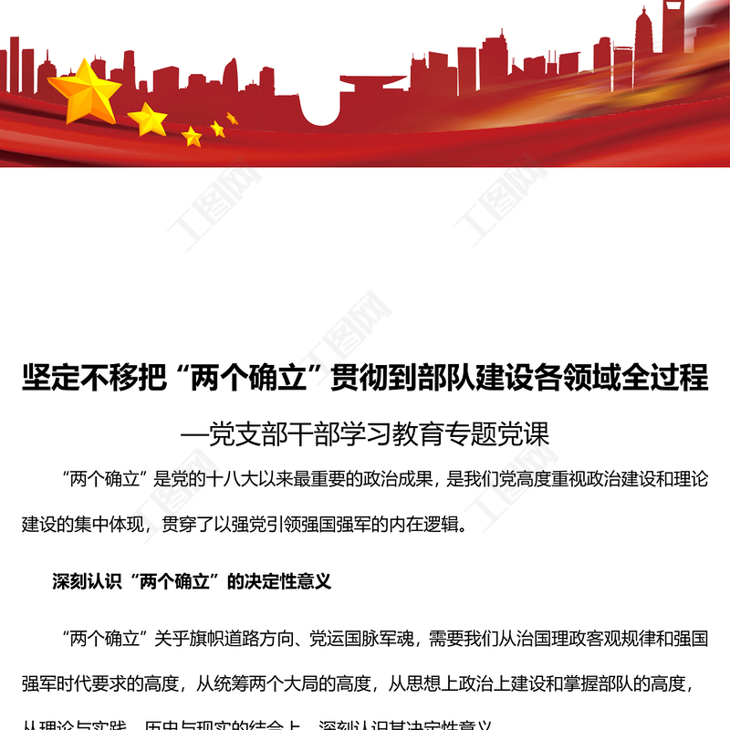 工圖網(wǎng)提供2022堅(jiān)定不移把“兩個(gè)確立”貫徹到部隊(duì)建設(shè)各領(lǐng)域全過程PPT黨建風(fēng)基層黨委黨支部干部學(xué)習(xí)教育專題黨課課件(講稿)供會(huì)員免費(fèi)下載。更多精彩黨課PPT素材,盡在工圖網(wǎng)。