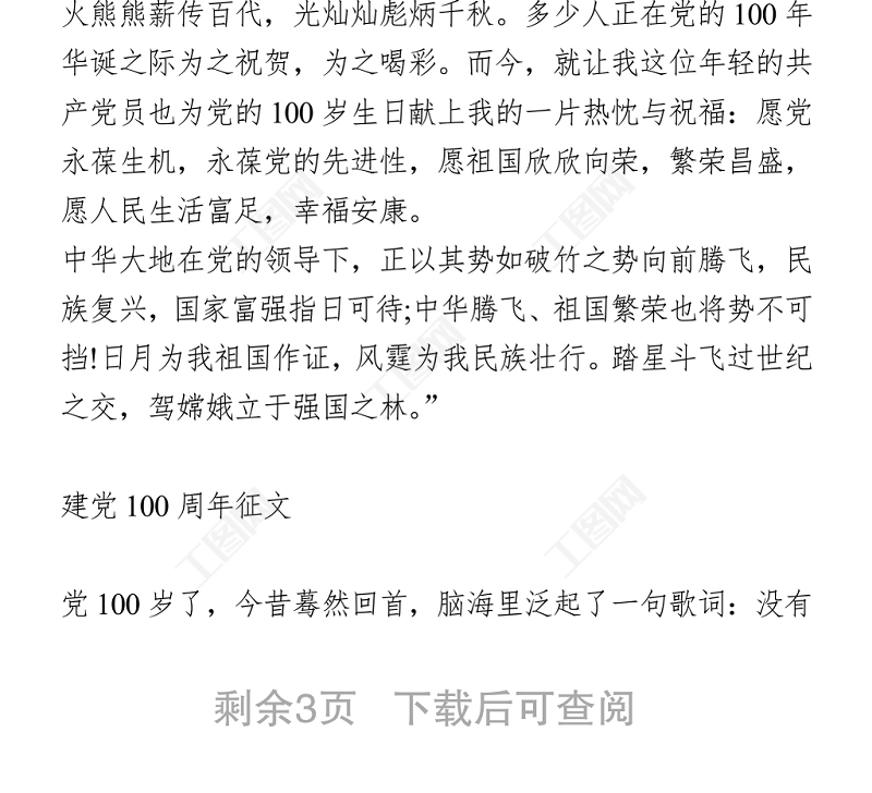 工圖網(wǎng)提供建黨100周年征文2篇供會(huì)員免費(fèi)下載。更多精彩黨課PPT素材,盡在工圖網(wǎng)。