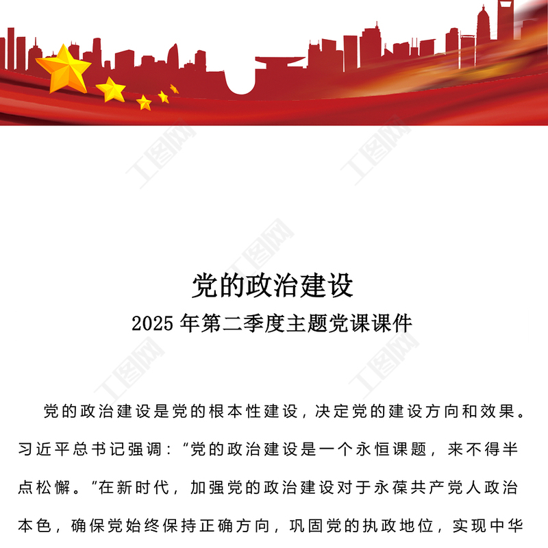 工圖網(wǎng)提供黨的政治建設(shè)PPT紅色簡(jiǎn)潔2025年第二季度主題黨課課件(講稿)供會(huì)員免費(fèi)下載。更多精彩黨課PPT素材,盡在工圖網(wǎng)。