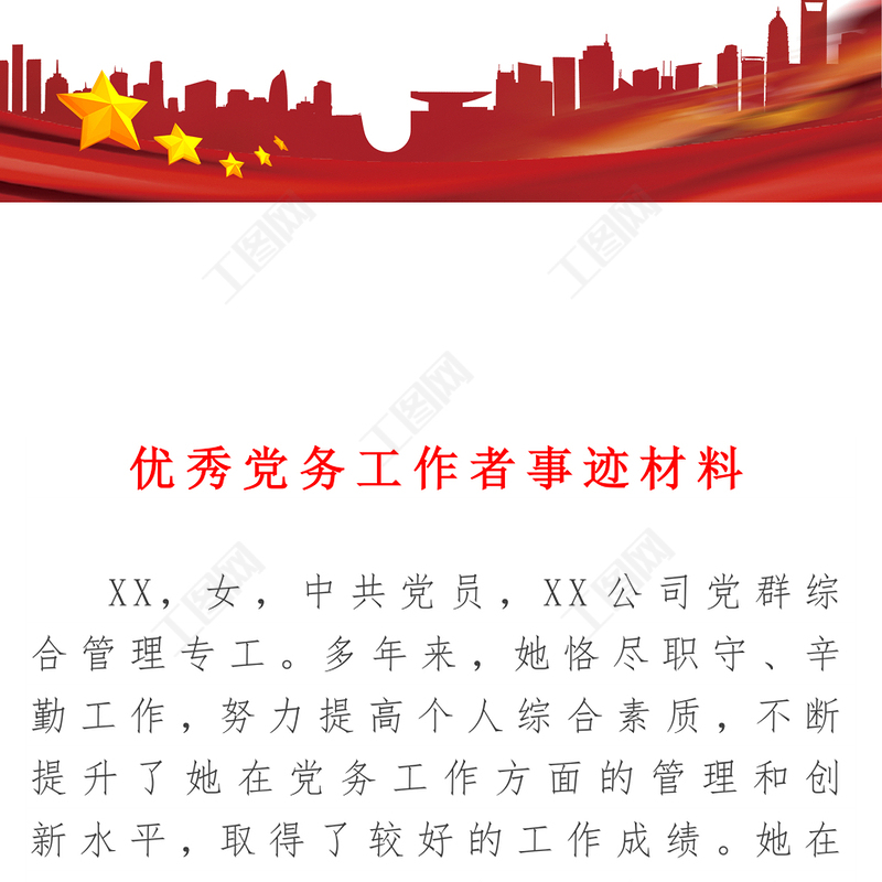 工圖網(wǎng)提供優(yōu)秀黨務(wù)工作者事跡材料供會員免費下載。更多精彩黨課PPT素材,盡在工圖網(wǎng)。