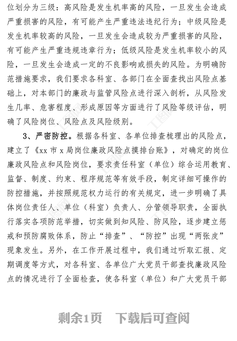工圖網(wǎng)提供局廉政風(fēng)險(xiǎn)點(diǎn)防控自查報(bào)告工作匯報(bào)總結(jié)供會(huì)員免費(fèi)下載。更多精彩黨課PPT素材,盡在工圖網(wǎng)。