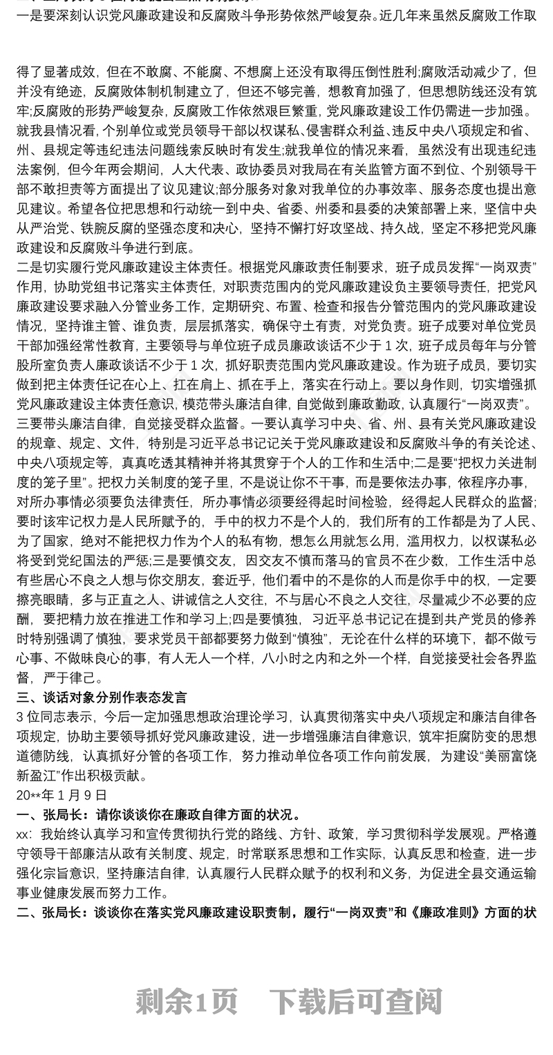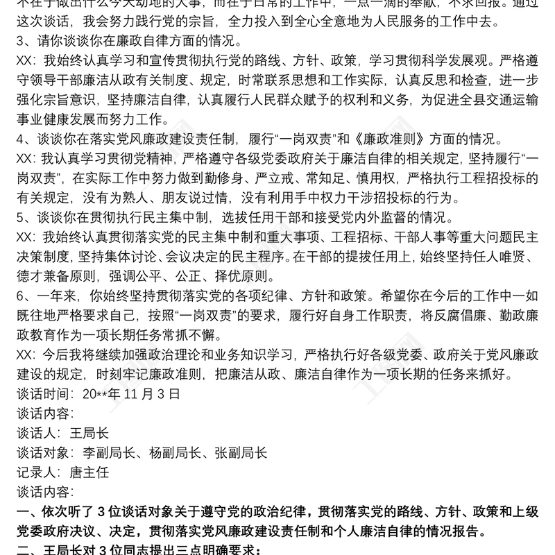 黨風(fēng)廉政建設(shè)談話記錄黨風(fēng)廉政談心談話記錄包含