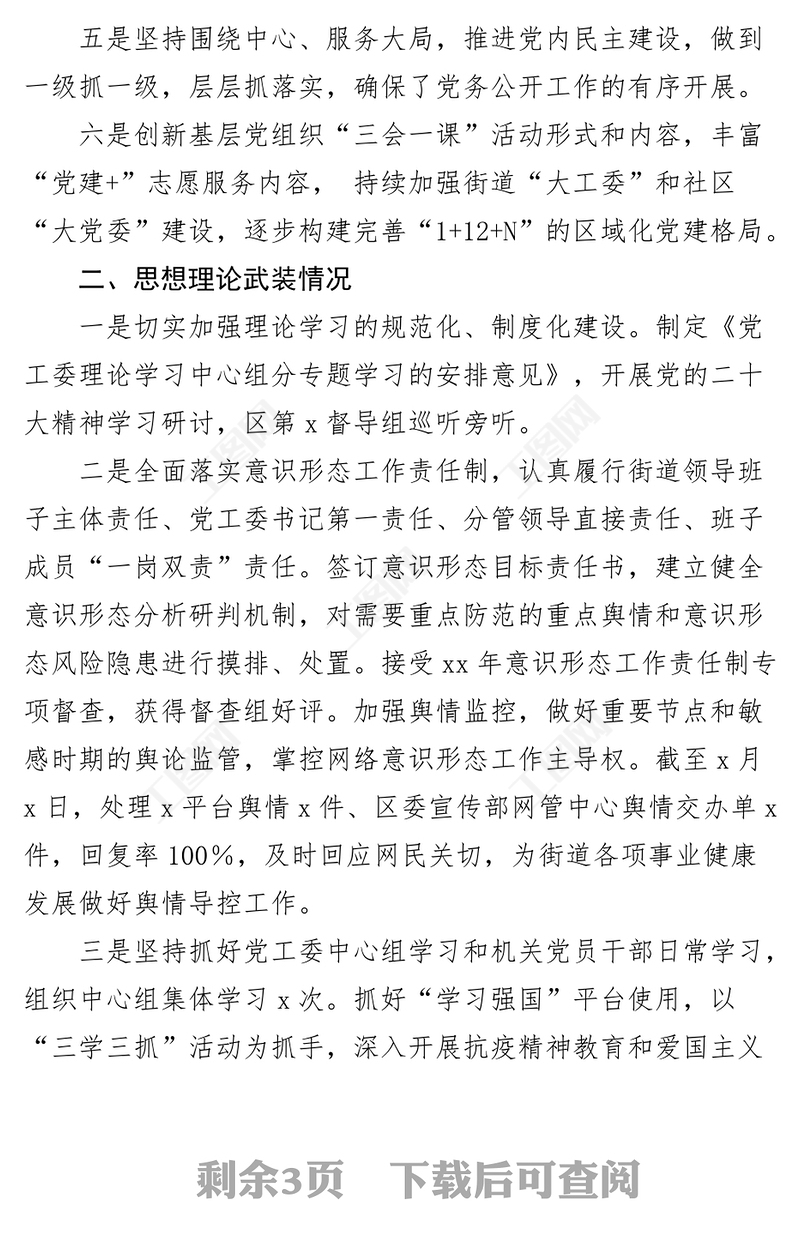 工圖網(wǎng)提供街道黨的建設(shè)工作報(bào)告總結(jié)匯報(bào)供會(huì)員免費(fèi)下載。更多精彩黨課PPT素材,盡在工圖網(wǎng)。