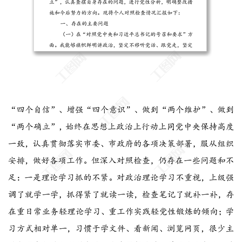 工圖網(wǎng)提供2022年度新時(shí)代普通黨員干部“四個(gè)方面”“四個(gè)對(duì)照”“兩個(gè)維護(hù)”“兩個(gè)確立”專(zhuān)題組織生活會(huì)對(duì)照檢查個(gè)人剖析擺正發(fā)言稿(三篇)供會(huì)員免費(fèi)下載。更多精彩黨課PPT素材,盡在工圖網(wǎng)。