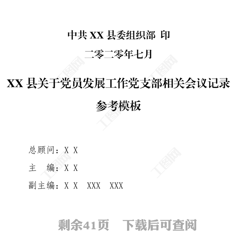 工圖網(wǎng)提供XX縣關(guān)于黨員發(fā)展工作黨支部相關(guān)會議記錄參考模板供會員免費下載。更多精彩黨課PPT素材,盡在工圖網(wǎng)。