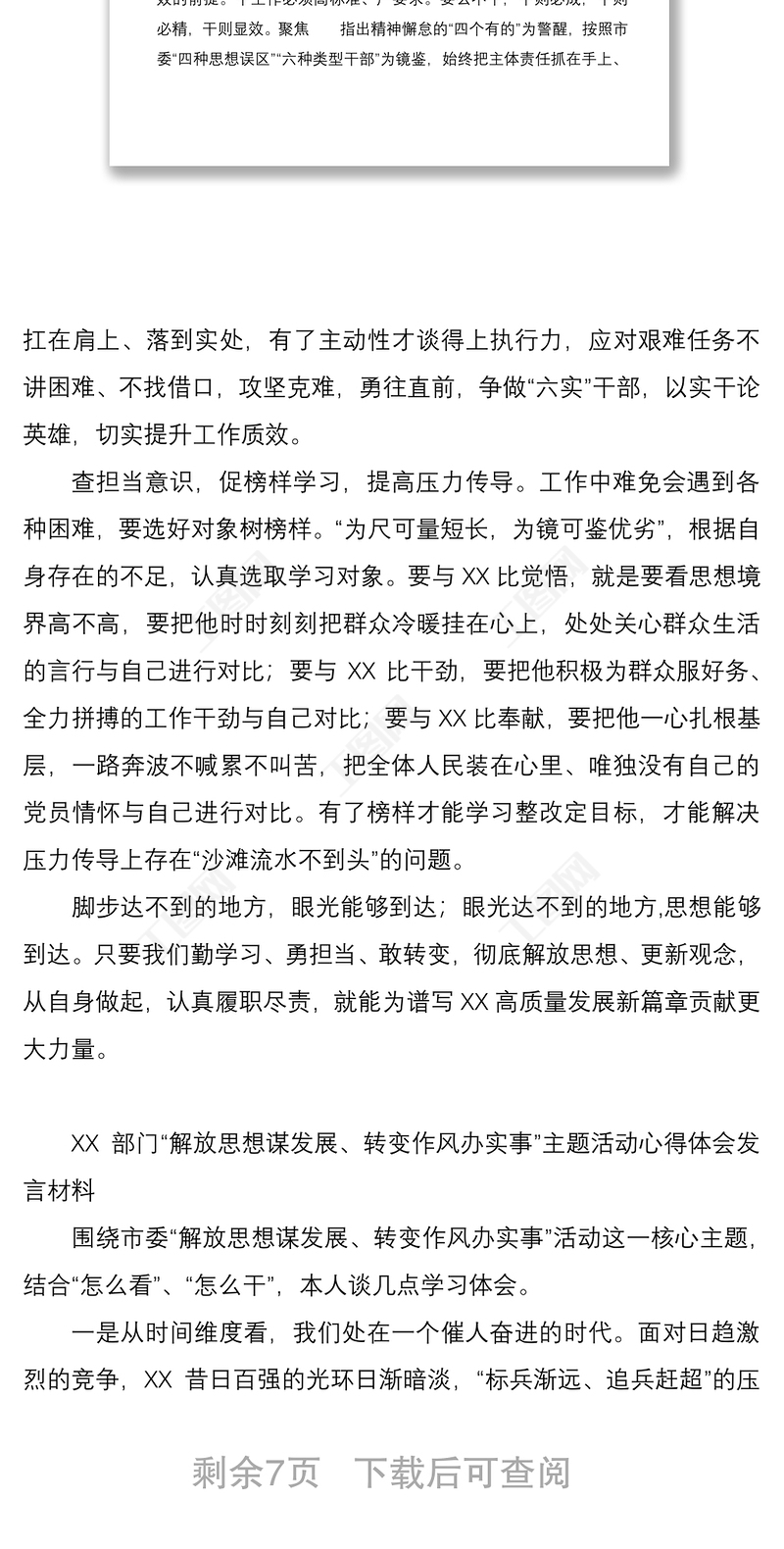 > 心得體會(huì) > XX部門解放思想謀發(fā)展轉(zhuǎn)變作風(fēng)辦實(shí)事主題活動(dòng)心得體會(huì)發(fā)言材料4篇.DOCX 【圖片、文字、動(dòng)畫均可編輯】