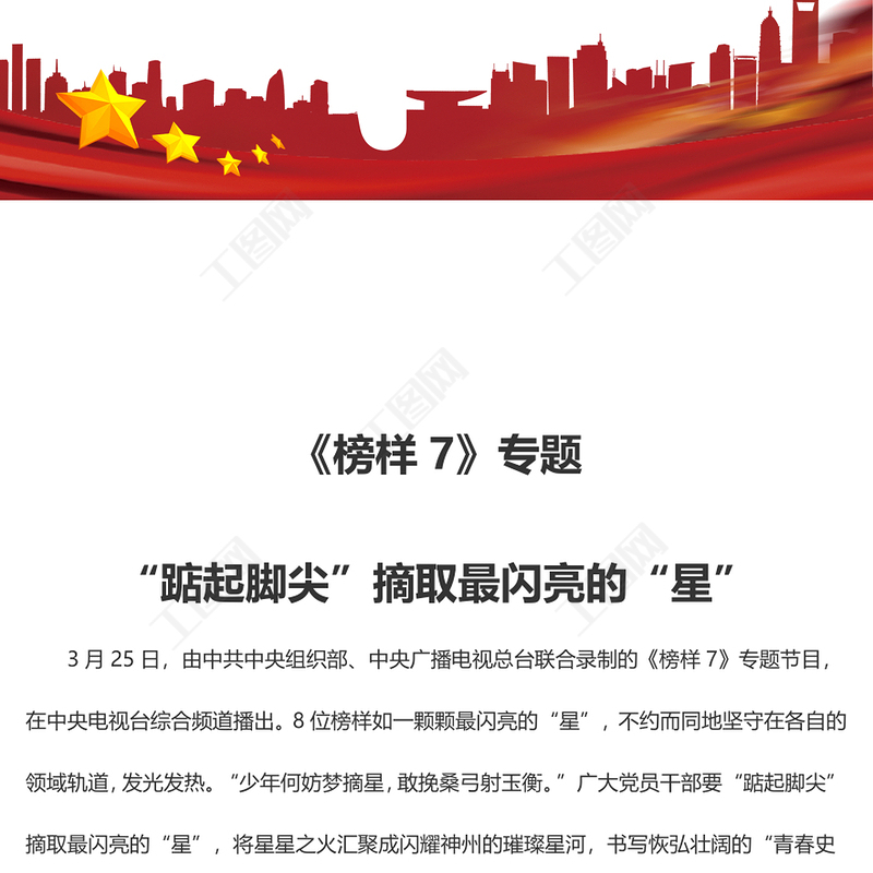 工圖網(wǎng)提供《榜樣7》專題“踮起腳尖”摘取最閃亮的“星”供會(huì)員免費(fèi)下載。更多精彩黨課PPT素材,盡在工圖網(wǎng)。