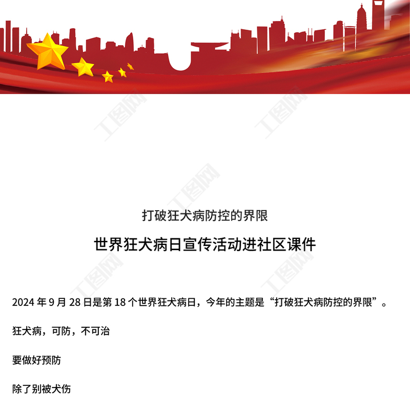 工圖網(wǎng)提供打破狂犬病防控的界限PPT大氣簡(jiǎn)潔世界狂犬病日宣傳活動(dòng)進(jìn)社區(qū)課件(講稿)供會(huì)員免費(fèi)下載。更多精彩黨課PPT素材,盡在工圖網(wǎng)。