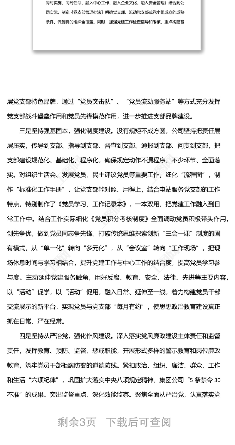 建筑公司黨支部黨課講稿2022有事好商量工作經(jīng)驗(yàn)交流材料在全市平安建設(shè)工作經(jīng)驗(yàn)交流會上的發(fā)言材料20212021施工項(xiàng)目黨支部黨建工作亮點(diǎn)經(jīng)驗(yàn)材料2022機(jī)關(guān)黨建工作提質(zhì)增效交流發(fā)言2022公司關(guān)于推進(jìn)基層黨建三基本建設(shè)與三基工作有機(jī)融合的實(shí)施方案保險公司黨建工作述職報告20222022融媒體中心經(jīng)驗(yàn)交流材料保險公司2021年企業(yè)黨建工作匯報財險公司2021半年度黨建工作匯報2023文旅公司黨建工作總結(jié)范文2023供電公司黨建活動總結(jié)范文2023交通強(qiáng)國建設(shè)經(jīng)驗(yàn)交流發(fā)言2023新時代中國特色社會主義思想經(jīng)驗(yàn)交流材料范文2023建筑公司黨建年度總結(jié)