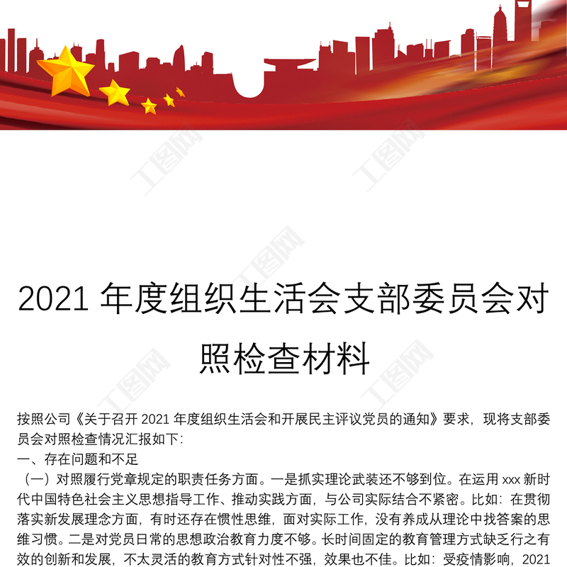 工圖網(wǎng)提供2021年度組織生活會支部委員會對照檢查材料供會員免費下載。更多精彩黨課PPT素材,盡在工圖網(wǎng)。