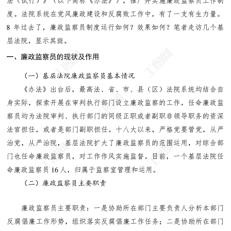 工圖網(wǎng)提供2021【調(diào)研報(bào)告】基層人民法院如何發(fā)揮廉政監(jiān)察員作用的調(diào)研報(bào)告供會(huì)員免費(fèi)下載。更多精彩黨課PPT素材,盡在工圖網(wǎng)。