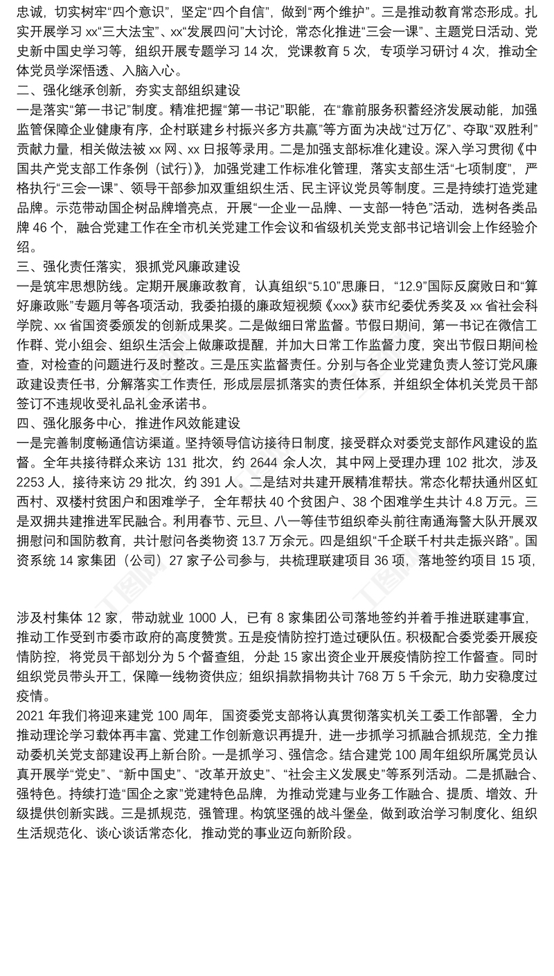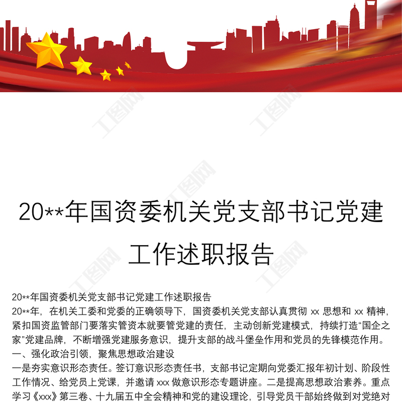 工圖網(wǎng)提供20**年國資委機(jī)關(guān)黨支部書記黨建工作述職報(bào)告供會員免費(fèi)下載。更多精彩黨課PPT素材,盡在工圖網(wǎng)。