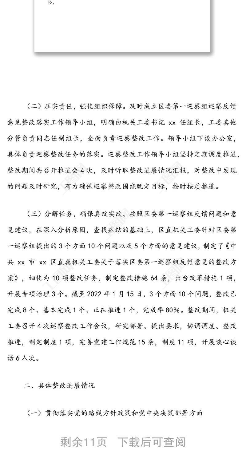 > 報(bào)告 > 區(qū)直屬機(jī)關(guān)工作委員會(huì)關(guān)于巡察整改進(jìn)展情況的報(bào)告.DOCX 【圖片、文字、動(dòng)畫均可編輯】
