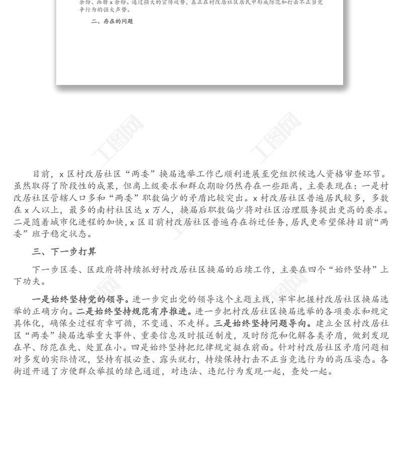 工圖網(wǎng)提供村改居社區(qū)“兩委”換屆選舉工作換屆工作總結(jié)供會(huì)員免費(fèi)下載。更多精彩黨課PPT素材,盡在工圖網(wǎng)。