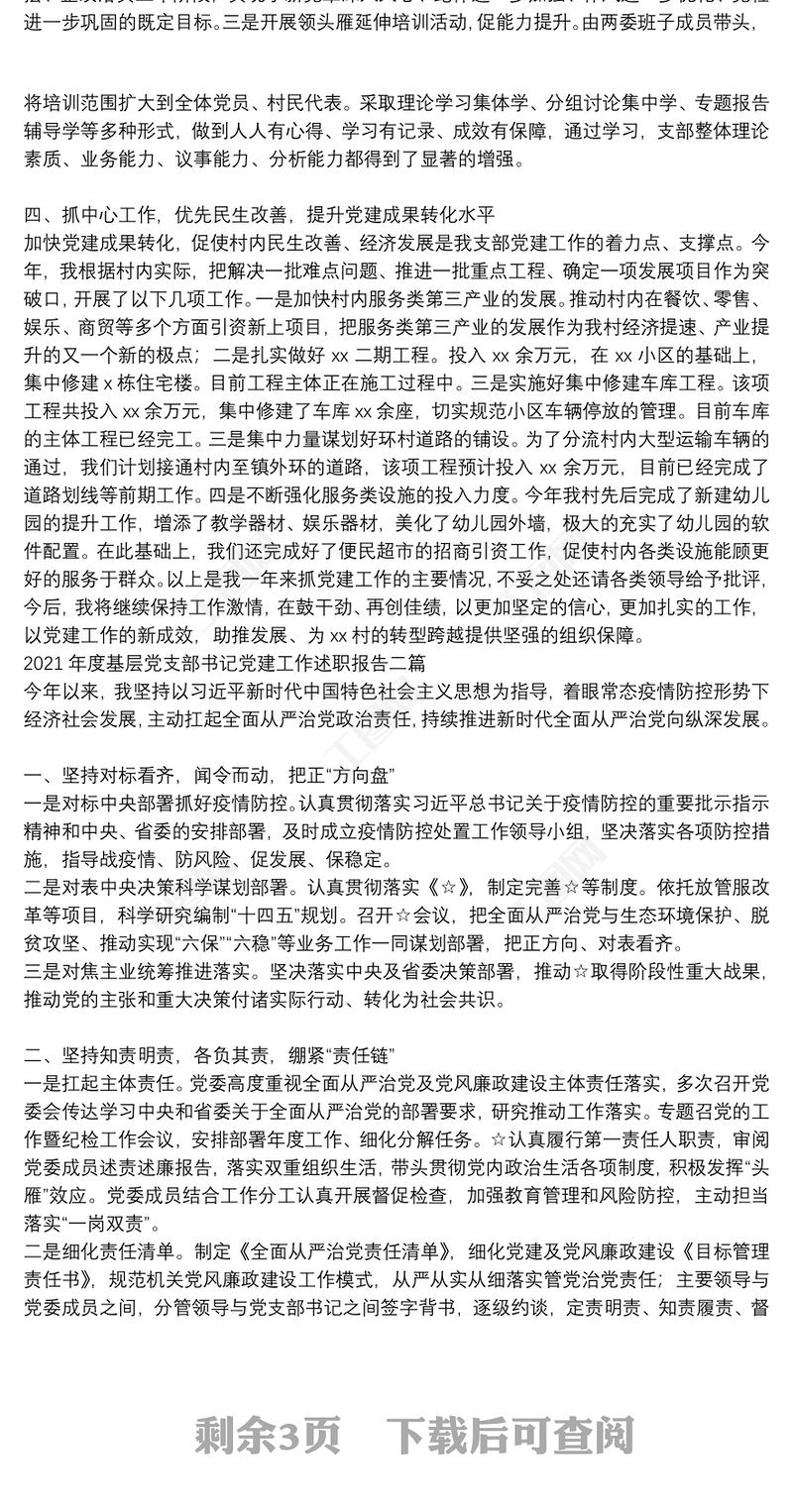 2021年度基層黨支部書記黨建工作述職報告三篇 Array