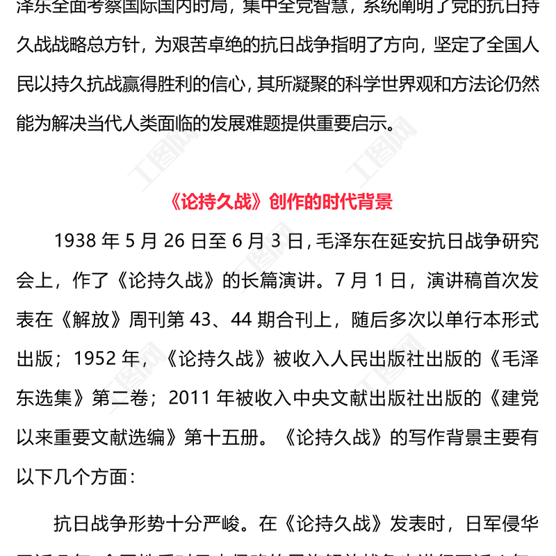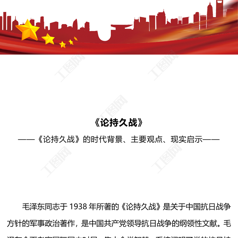工圖網(wǎng)提供論持久戰(zhàn)PPT紅色簡(jiǎn)潔《論持久戰(zhàn)》的時(shí)代背景主要觀點(diǎn)現(xiàn)實(shí)啟示黨課(講稿)供會(huì)員免費(fèi)下載。更多精彩黨課PPT素材,盡在工圖網(wǎng)。