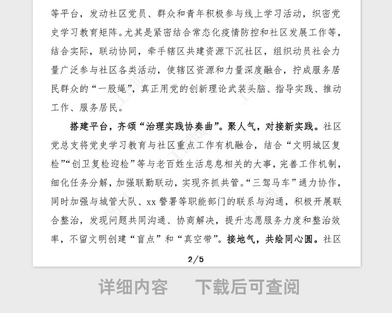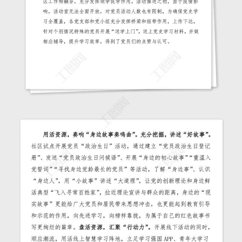 > 經(jīng)驗(yàn)事跡 > 2篇黨史學(xué)習(xí)教育工作經(jīng)驗(yàn)匯報(bào)范文2篇工作總結(jié)匯報(bào)報(bào)告社區(qū)黨總支村黨支部.DOCX 【圖片、文字、動畫均可編輯】