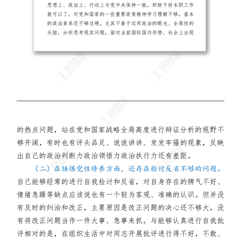 工圖網(wǎng)提供2021黨史學(xué)習(xí)教育專題組織生活會個人對照檢查材料供會員免費下載。更多精彩黨課PPT素材,盡在工圖網(wǎng)。